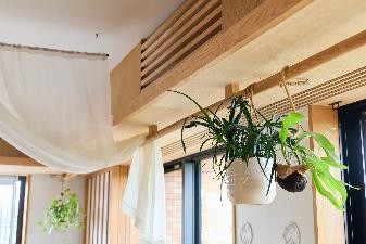 洗濯物が干せるバーを端から端まで設置。木製にすることで和の雰囲気と調和。植物をハンギングする場所としても便利。