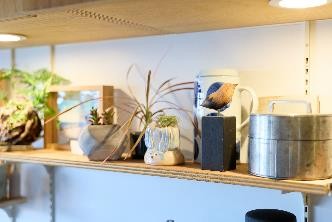 片付いた家=物がない家ではない。お気に入りの小物がところどころに配置され温もりを感じる。グリーンは手入れが簡単なタイプをチョイス。