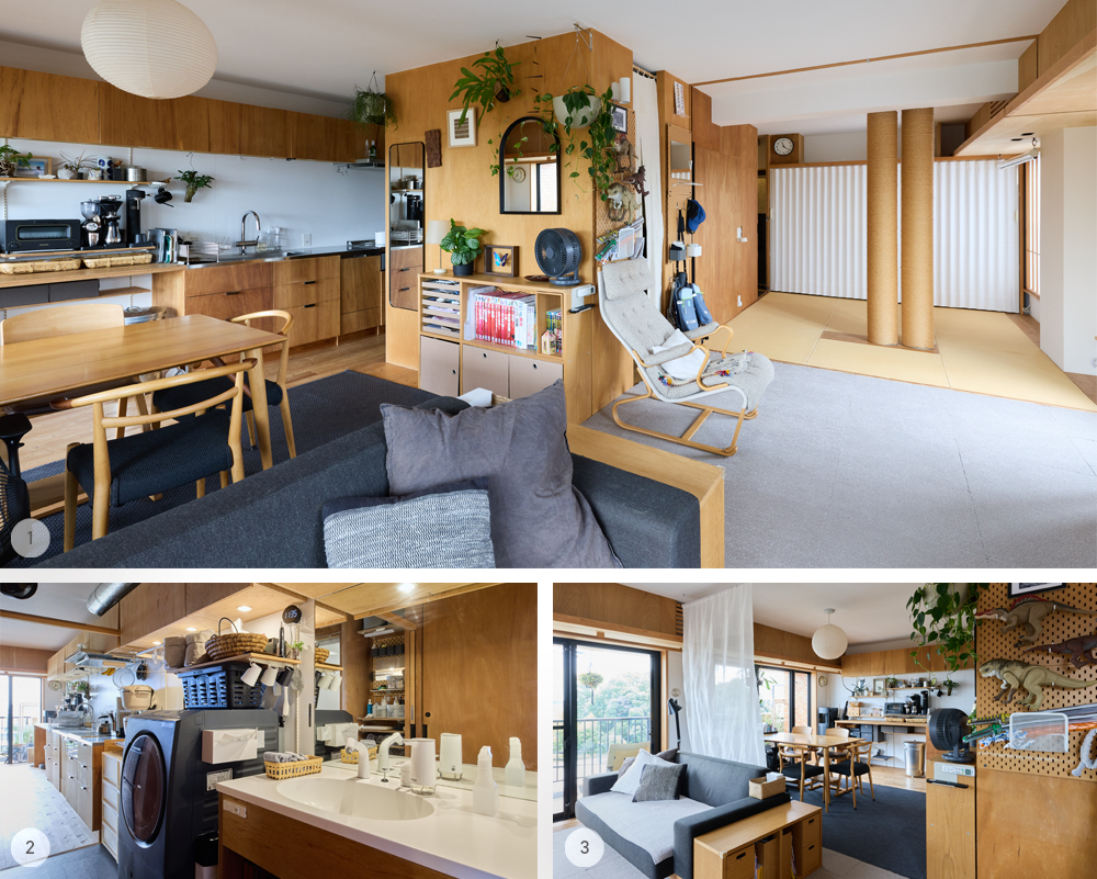 ①子どもが小さいうちは個室を使わない家庭が多く、個室を設けず必要な時に区切るスタイル。中央に浴室やお手洗いをまとめ、回遊できる間取り。