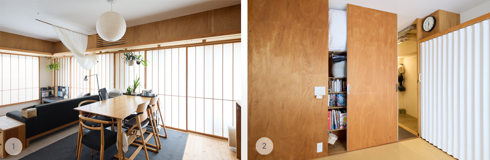 ①カーテンの代わりに障子を使用し、柔らかな光に包まれる空間に。破れにくい障子紙で耐久性も確保。