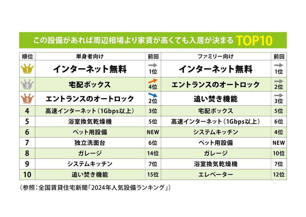 単身者・ファミリーともに1位の「インターネット無料」は、単身者で10年連続、ファミリー向けで9年連続となっています。もはや必須の設備であり、近隣競合との差異化を図るうえでも欠かせない設備といえるでしょう。
