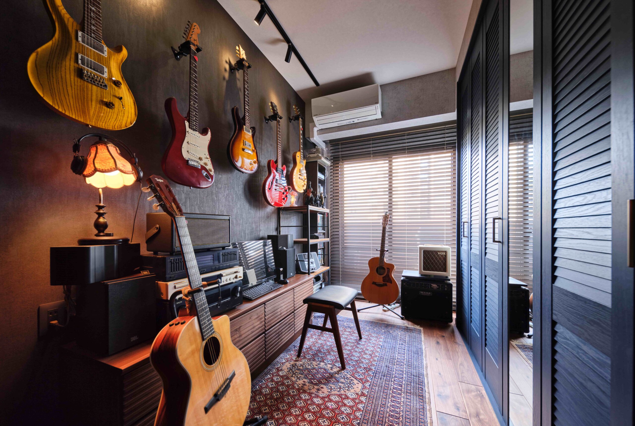ヴィンテージ感あふれるご主人の趣味部屋。ギターコレクションの収納とディスプレイスペースを新設しました。