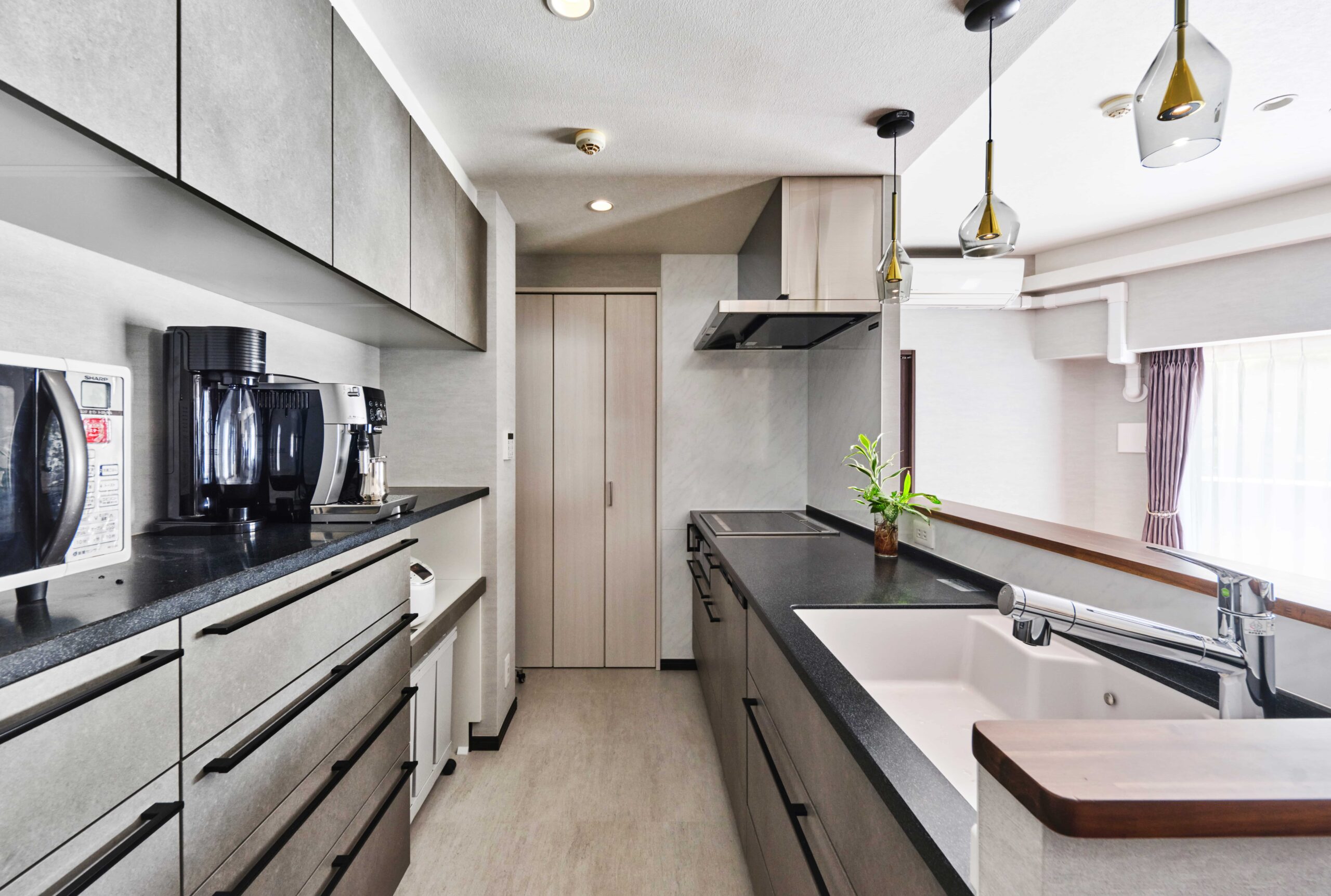 壁付けから対面式に変更したキッチン。折戸の先にはパントリーを備え、