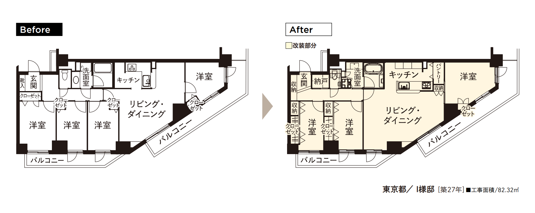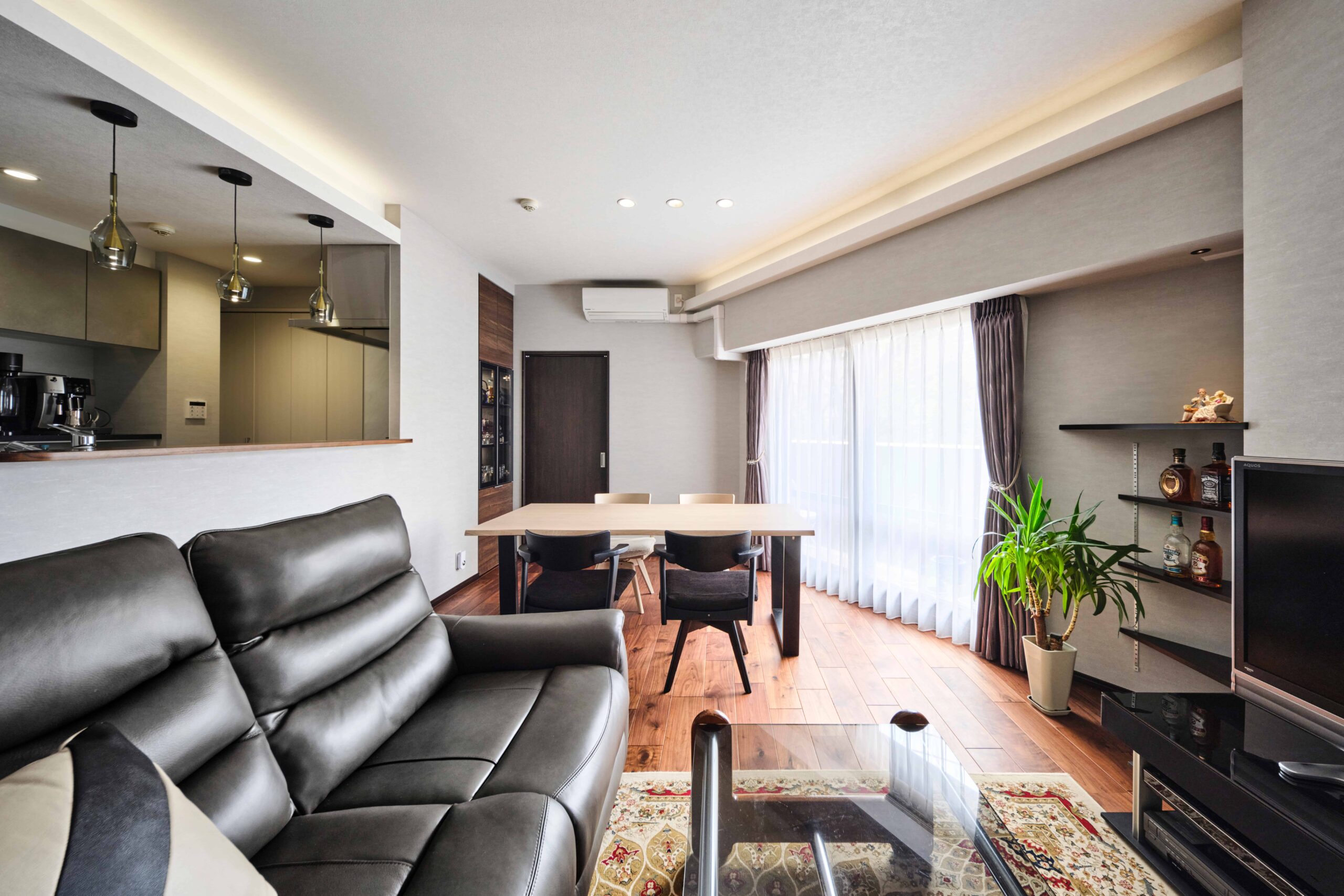 お子さまの独立をきっかけに、ご夫婦お二人が快適に暮らせる住まいへとフルリノベーションを行いました。ご主人のギターコレクションを収納できるスペース、対面キッチン、そして高い断熱性・遮音性を備えた空間づくりを希望されました。既存の壁を取り払い間取りを一新し、リビングからアクセスできる主寝室や、それぞれが趣味を愉しむための部屋を設けています。床には上質感のある挽板フローリングを採用し、間接照明の柔らかな光に包まれた温もりある空間を演出。床暖房を設置し、すべての窓を二重サッシにすることで断熱性も高めました。「断熱性、遮音性ともに大変満足しています。照明やディスプレイの提案も素晴らしく、リフォームして本当に良かったと感じています」とのお声をいただきました。