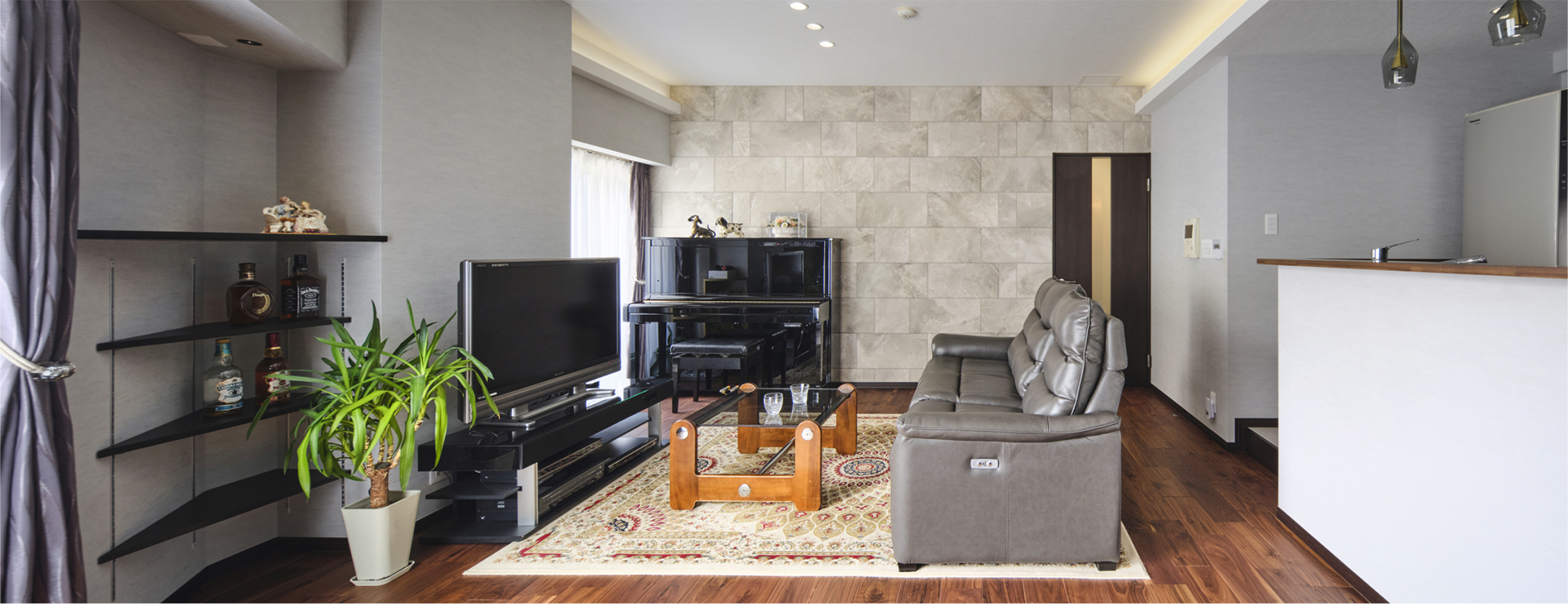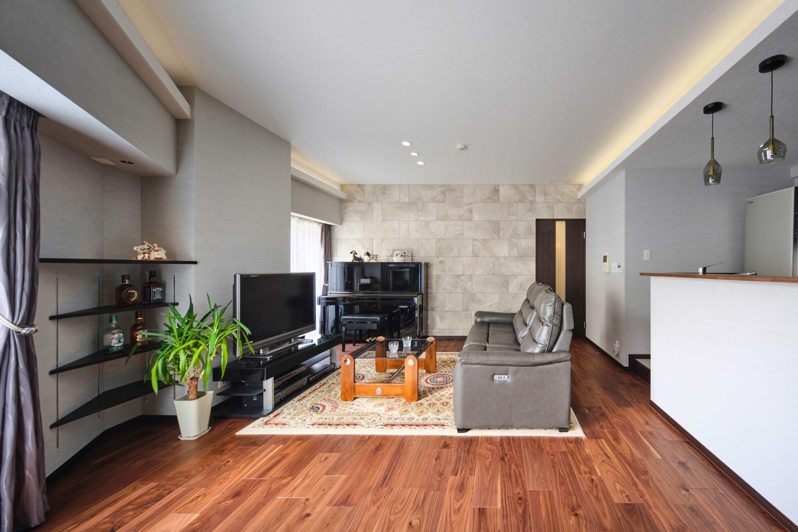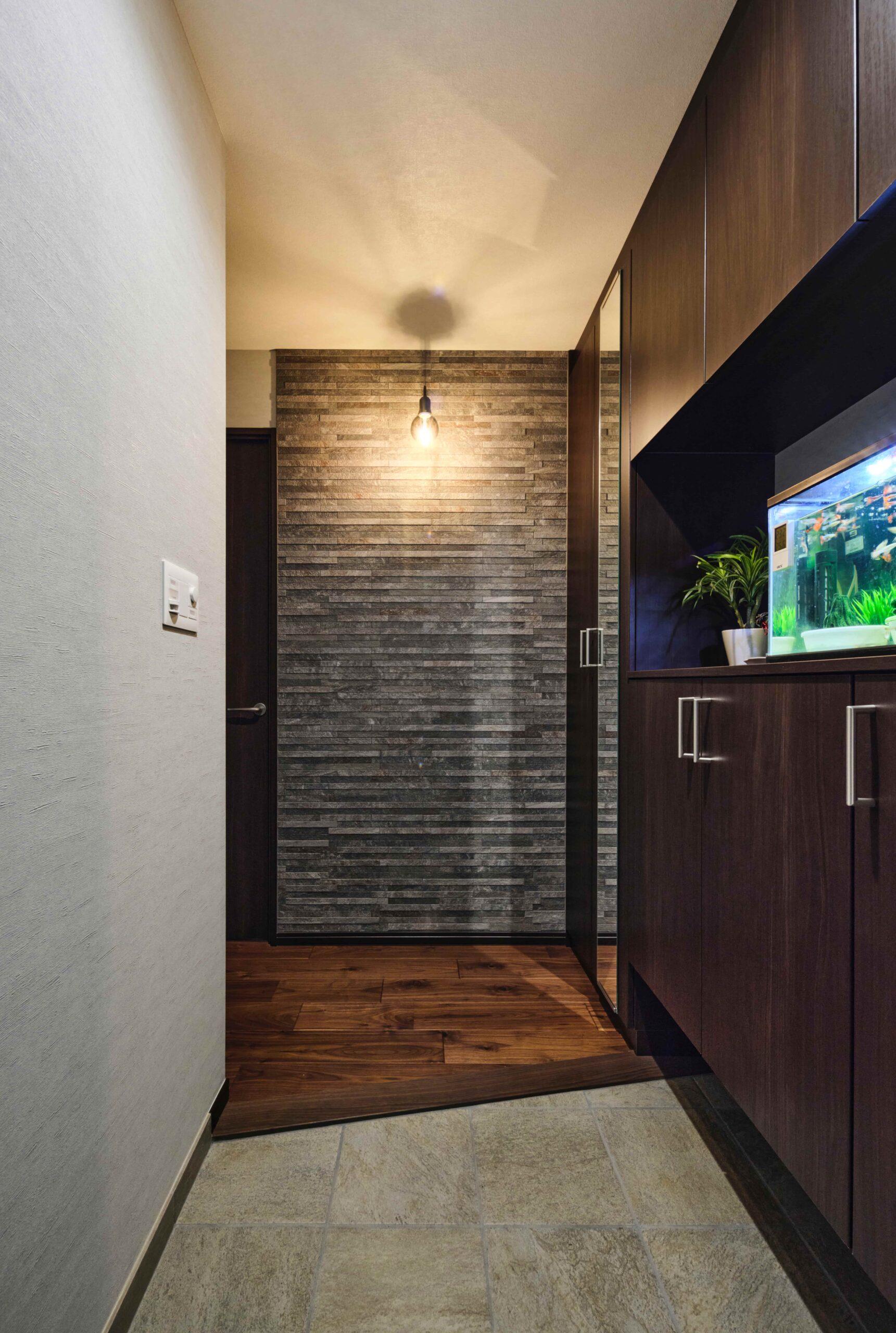 正面には石材調タイルのアクセントウォールを施し、ペンダントライトが空間の表情を引き立てています。