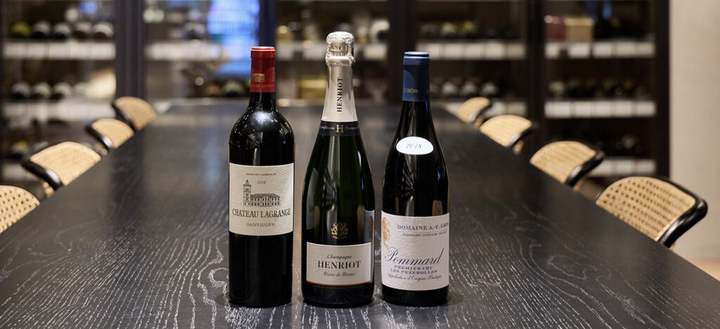 人見さんセレクトのフランスワイン。左から、ボルドーの「シャトー・ラグランジュ」、シャンパーニュの「アンリオ」、ブルゴーニュの「アンヌ・フランソワーズ・グロ」。