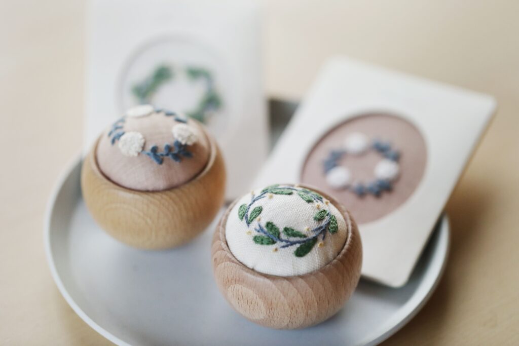 ① ラップランド地方に伝わる木製の「ククサカップ」をピンクッションの土台にした北欧らしいアイテム