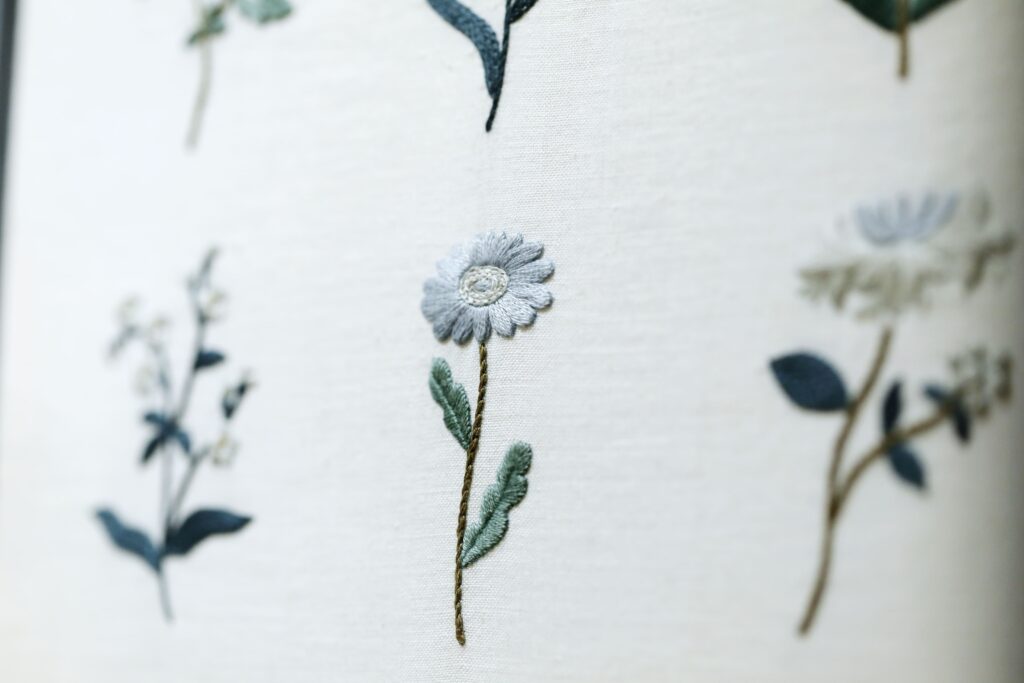 北欧刺繍の魅力は独特な色彩にあります。手芸店で見かける原色に近い糸とは異なり、北欧の生活空間に馴染むような繊細な中間色(グレイッシュカラー)が多く使われます。そのため、仕上がりは甘すぎず暮らしにすんなり溶け込むアイテムとして使い続けることができます。