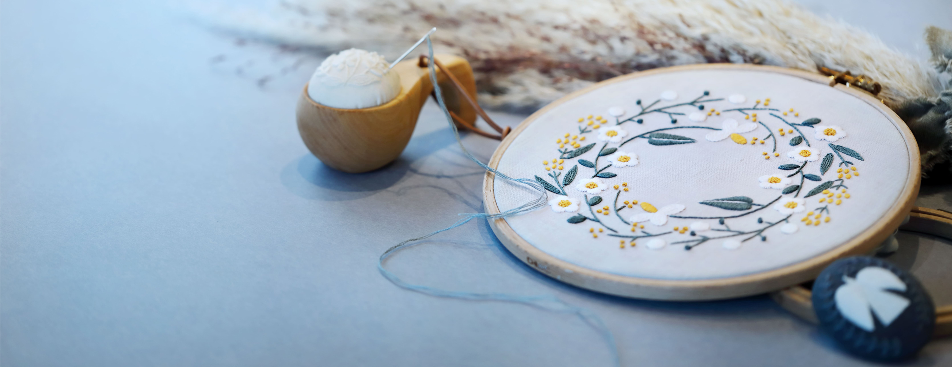 道具は手芸店やインターネットで購入できますが、どれがいいか迷う時は図案が生地に印刷されて使用する糸もセットになった「スタートキット」を使ってみることもできます。また、材料や道具を揃えなくても手ぶらで参加できる「体験レッスン」もあるので、とりあえず雰囲気を味わいたい方にはおすすめです。