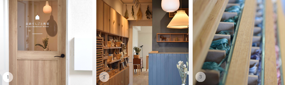 ② 教室のエントランスには、教室で作られた成果物や材料などが並び、手芸の楽しさやワクワク感を感じさせてくれる
